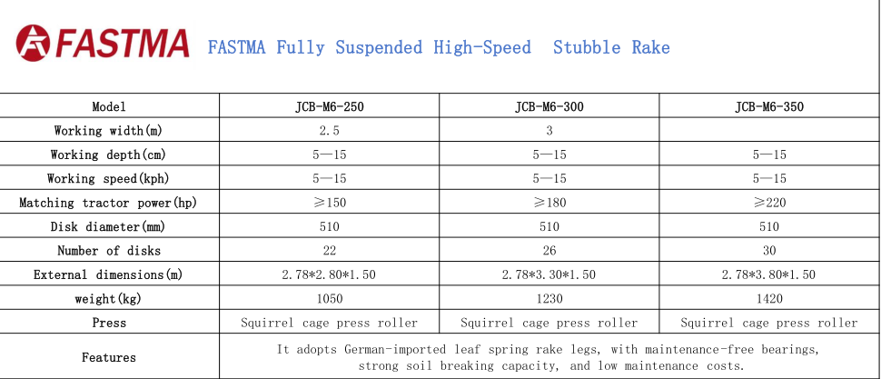 A grade destruidora de restolho para serviço pesado tem uma largura de trabalho de 2,5-3,5 m e, combinada com uma velocidade de trabalho de 5-15 km / h, pode cultivar mais de 100 mu de terra por dia, melhorando significativamente a eficiência do preparo da terra após a colheita de outono. Grade destruidora de restolho arrastada por trator, projetada para tratores com potências de ≥150hp, ≥180hp e ≥220cv, respectivamente. O que atende às necessidades de usuários com diferentes escalas de plantio. O design totalmente suspenso, combinado com um sistema de nivelamento hidráulico, permite o controle remoto a partir da cabine do trator, facilitando a operação até mesmo para usuários novatos.