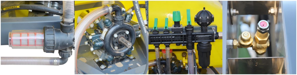 Em segundo lugar está a bomba de diafragma de alta pressão, que fornece forte força para empurrar o líquido através do sistema da máquina de pulverização rebocada. O terceiro é a barra de pulverização ajustável, que pode ser estendida para corresponder a diferentes larguras de campo para a máquina de pulverização rebocada.